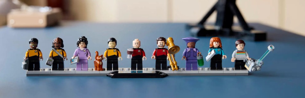Ogni minifigure è accompagnata da accessori unici: tazza da tè, trombone con supporto, phaser, tricorder, padd, cassetta da ingegneria, bottiglia, generatore di raggio traente portatile e persino il gatto Spot di Data.